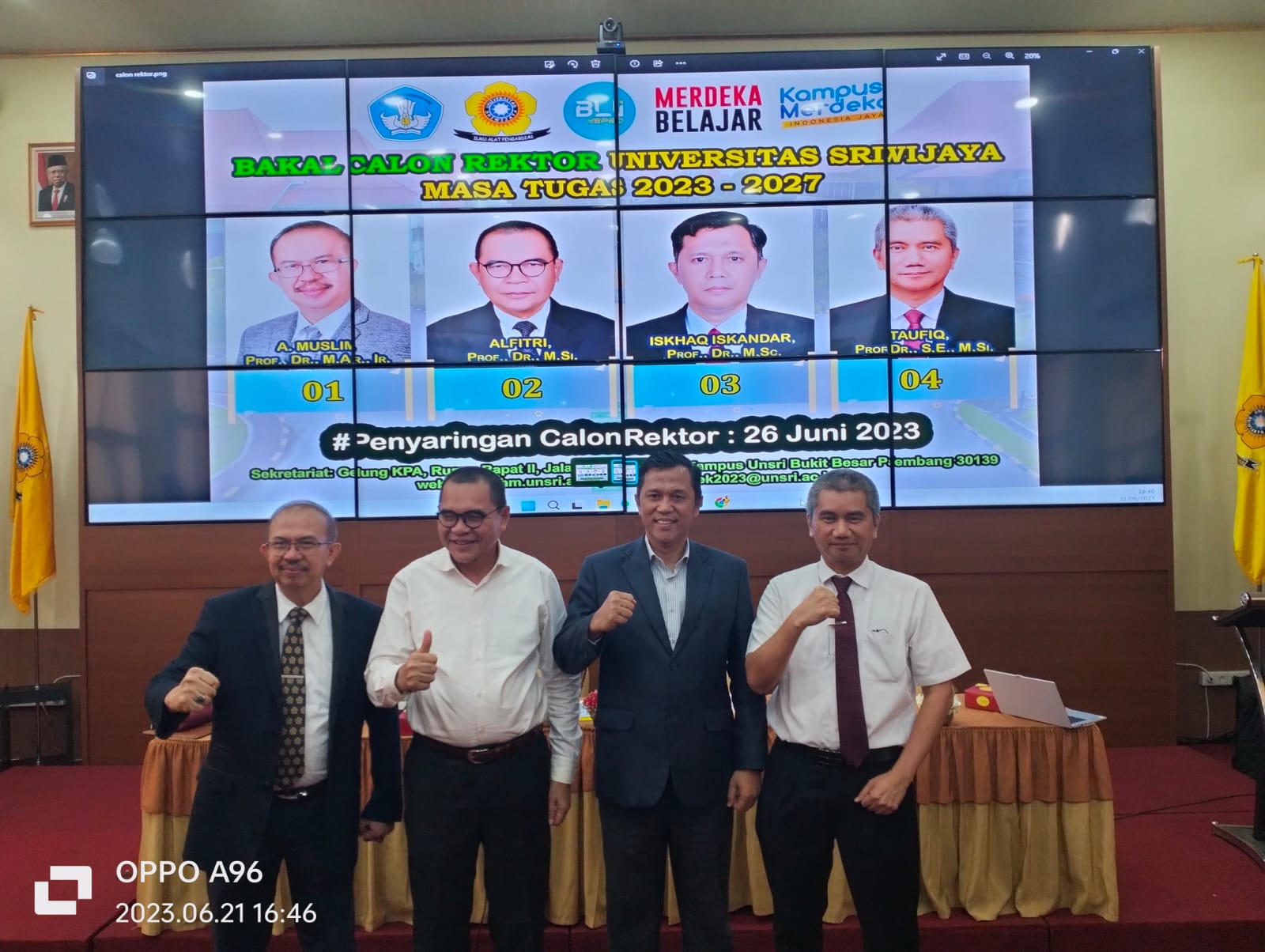 PALEMBANG, SentralPost – Penyaringan pengundian nomor urut Bakal Calon Rektor Universitas Sriwijaya Masa Tugas 2023-2027 dilaksanakan di Balai Gedung Bahasa Unsri Bukit Besar, Rabu (21/6/2023). Untuk nomor urutnya adalah