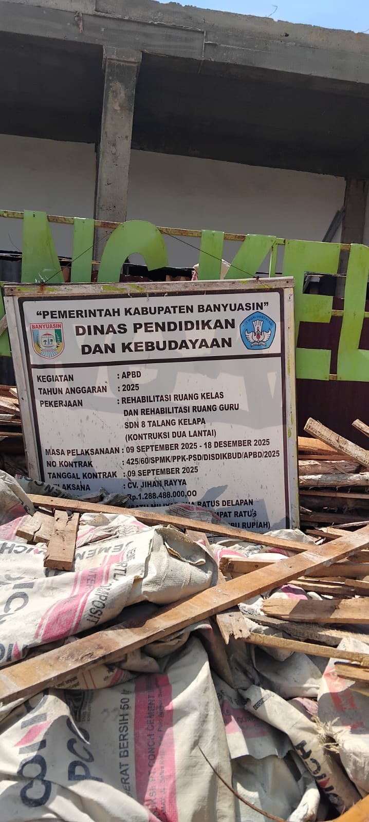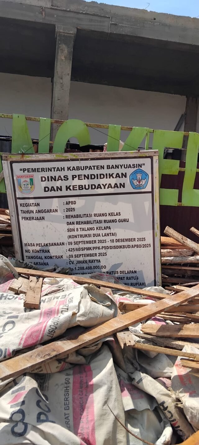 Berdasarkan pantauan dan informasi yang dihimpun di lapangan menyebutkan, Proyek rehabilitasi SDN 8 Talang Kelapa itu dengan No kontrak 425/60/SPMK/PPK-PSD/DISDIKBUD /APBD/2025. Dikerjakan oleh CV. Jihan Rayya yang mengunakan dana APBD sebesar 1.288.488.000,00