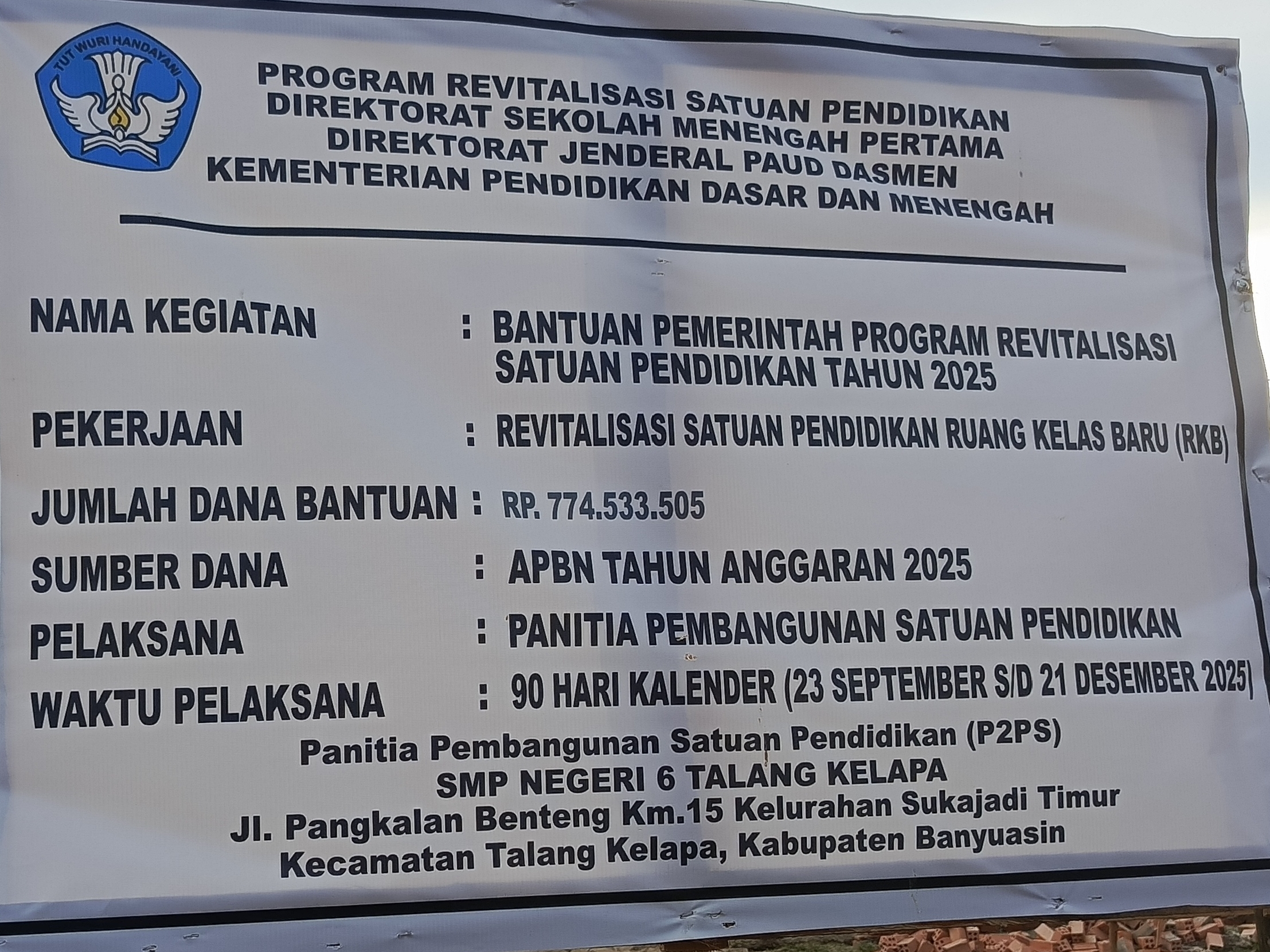 Diantaranya melalui program Revatilasasi sekolah tahun 2025, dimana program ini sudah mulai berjalan dan salah satu sekolah penerima manfaat dari program ini adalah SMPN 6 Talang Kelapa Kabupaten Banyuasin.