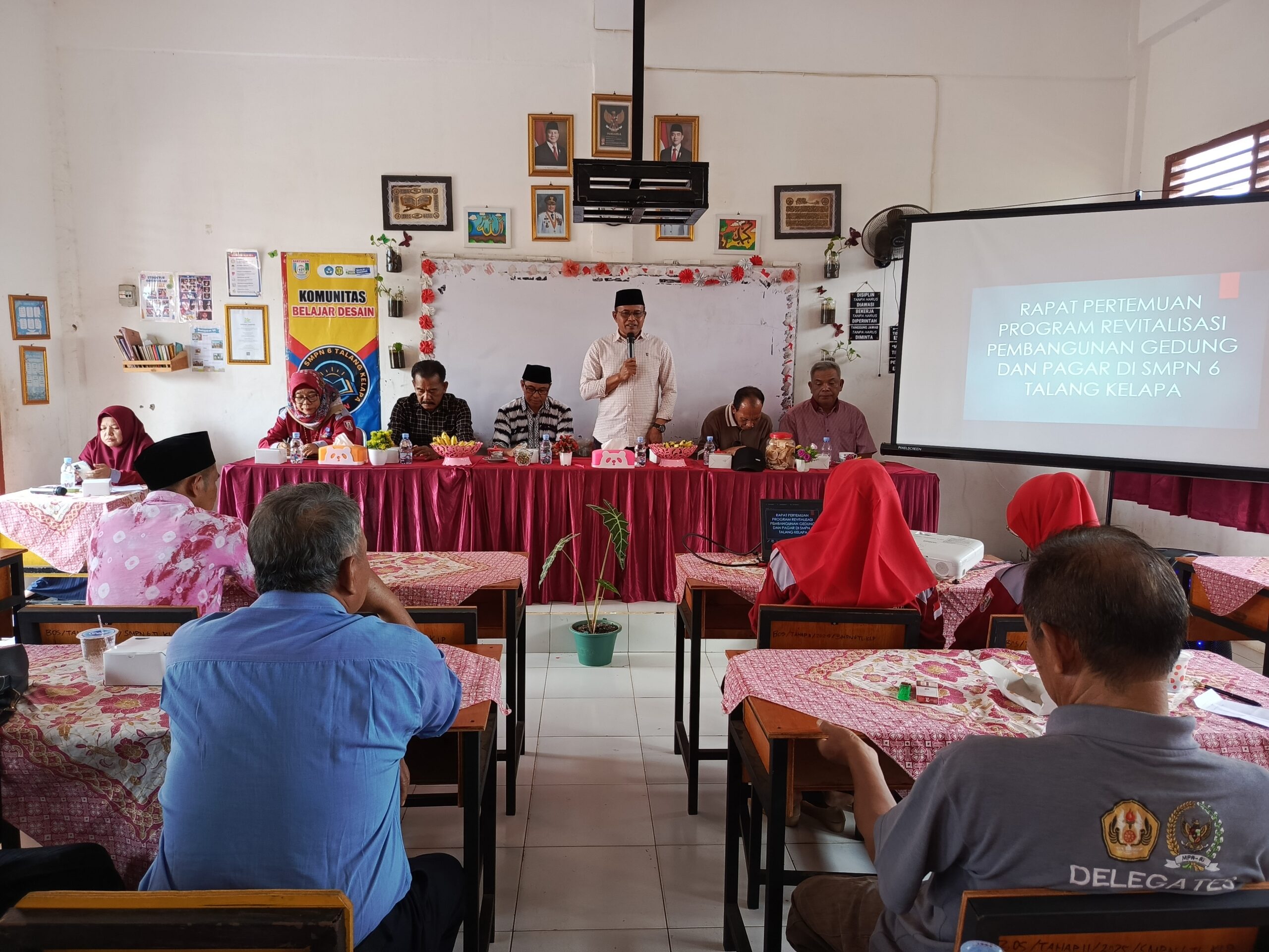 Dinas pendidikan dan Kebudayaan (Disdikbud) Kabupaten Banyuasin melalui Koordinator wilayah (Korwil) Kecamatan Talang Kelapa, Didik Usyadi,M.Pd, saat mengikuti rapat pertemuan di SMPN 6 Talang Kelapa pada Sabtu (18/10/2025)., berharap program revitalisasi pembangunan gedung dan pagar di SMPN 6 Talang Kelapa mendapat dukungan dari semua lapisan masyarakat terutama warga Komplek Griya Handayani agar proses pembangunan dapat berjalan dengan baik dan lancar.