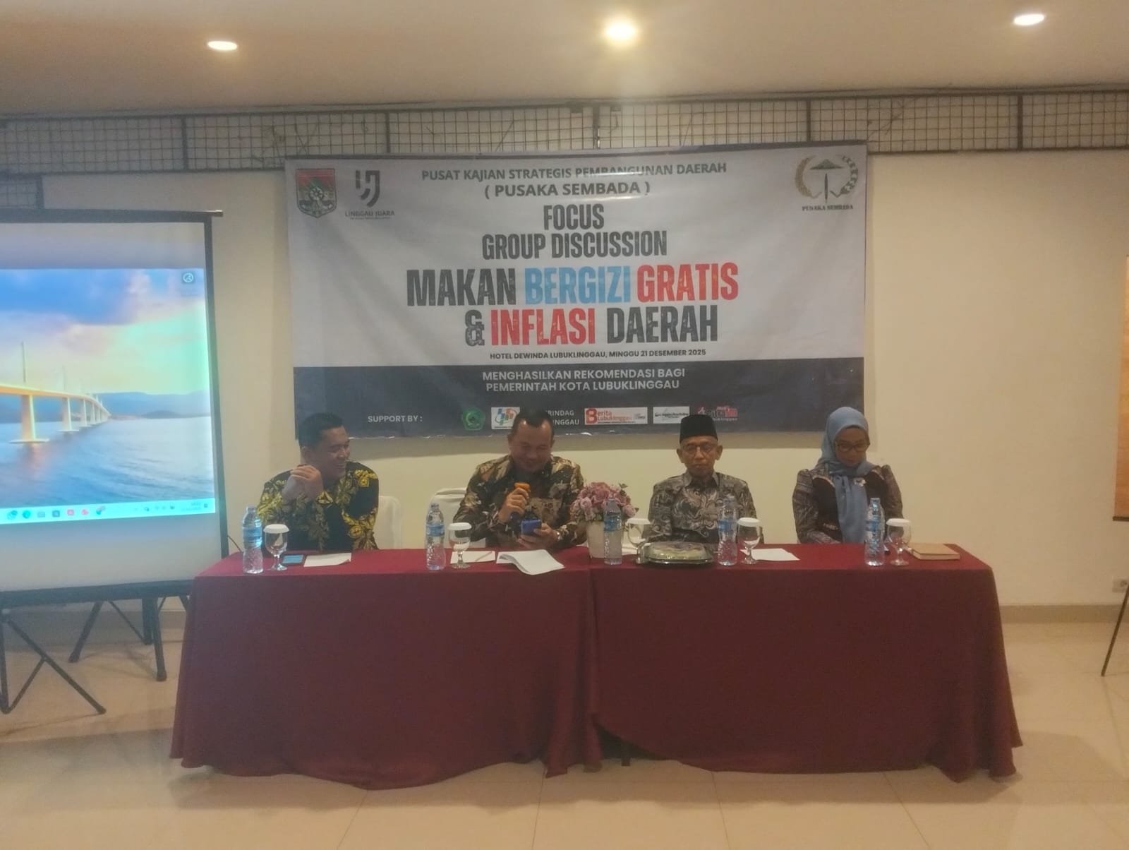 Lubuk Linggau, Sentralpost.co – Pusat Kajian Strategis Pembangunan Daerah (PUSAKA Sembada) sukses menggelar Focus Group Discussion (FGD) bertema _“Program Makan Bergizi Gratis (MBG) dan Inflasi Daerah”_ pada Minggu (21/12), di lantai II Hotel Dewinda, Kota Lubuklinggau. Kegiatan ini menjadi ruang dialog strategis yang mempertemukan pemangku kepentingan lintas sektor untuk merumuskan solusi konkret terhadap tantangan inflasi dan penguatan program MBG di daerah.