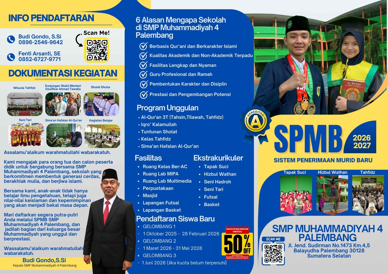 SMP Muhammadiyah 4 Palembang terus konsisten menghadirkan pendidikan yang mengintegrasikan nilai-nilai Qur’ani dengan pembentukan karakter. Dengan visi mencetak generasi muslim yang berilmu, berakhlak, dan berprestasi, sekolah ini menyelenggarakan berbagai program yang mendukung peningkatan potensi akademik maupun non-akademik siswa.