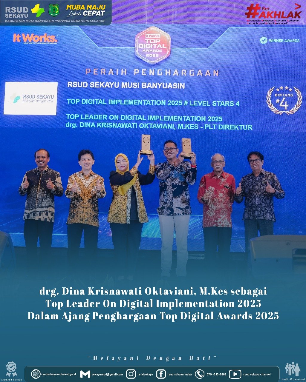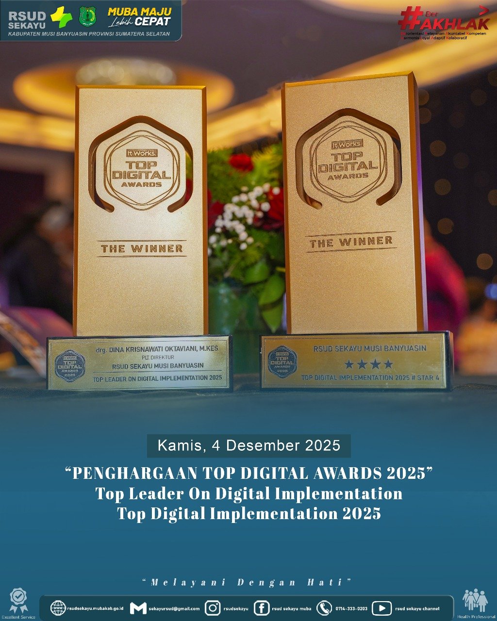 Penghargaan pertama yang diraih adalah TOP Digital Implementation 2025 # Level Stars 4, sebuah pengakuan atas keberhasilan RSUD Sekayu Muba dalam mempercepat transformasi digital melalui inovasi berkelanjutan, mulai dari sistem informasi kesehatan hingga layanan publik berbasis teknologi.