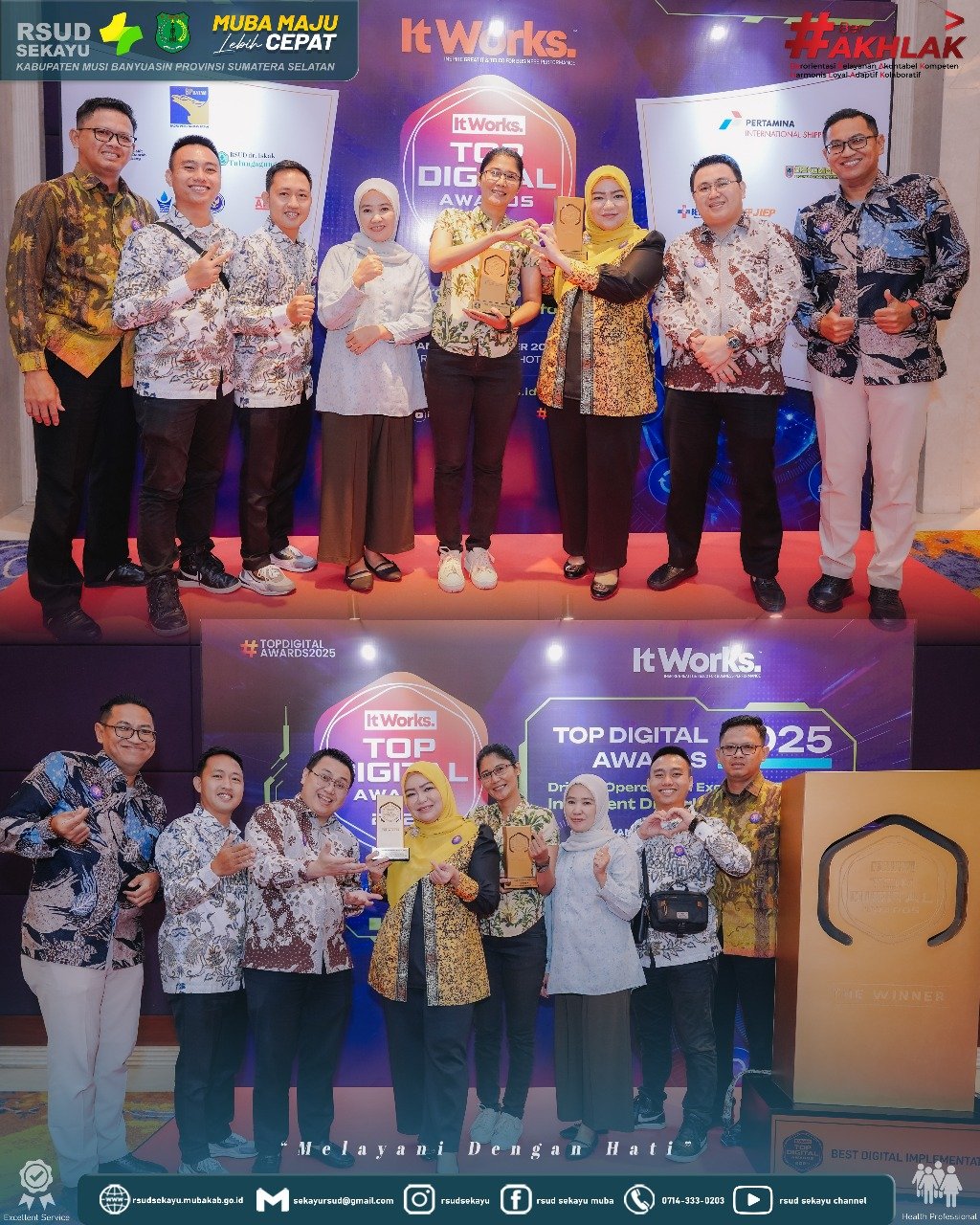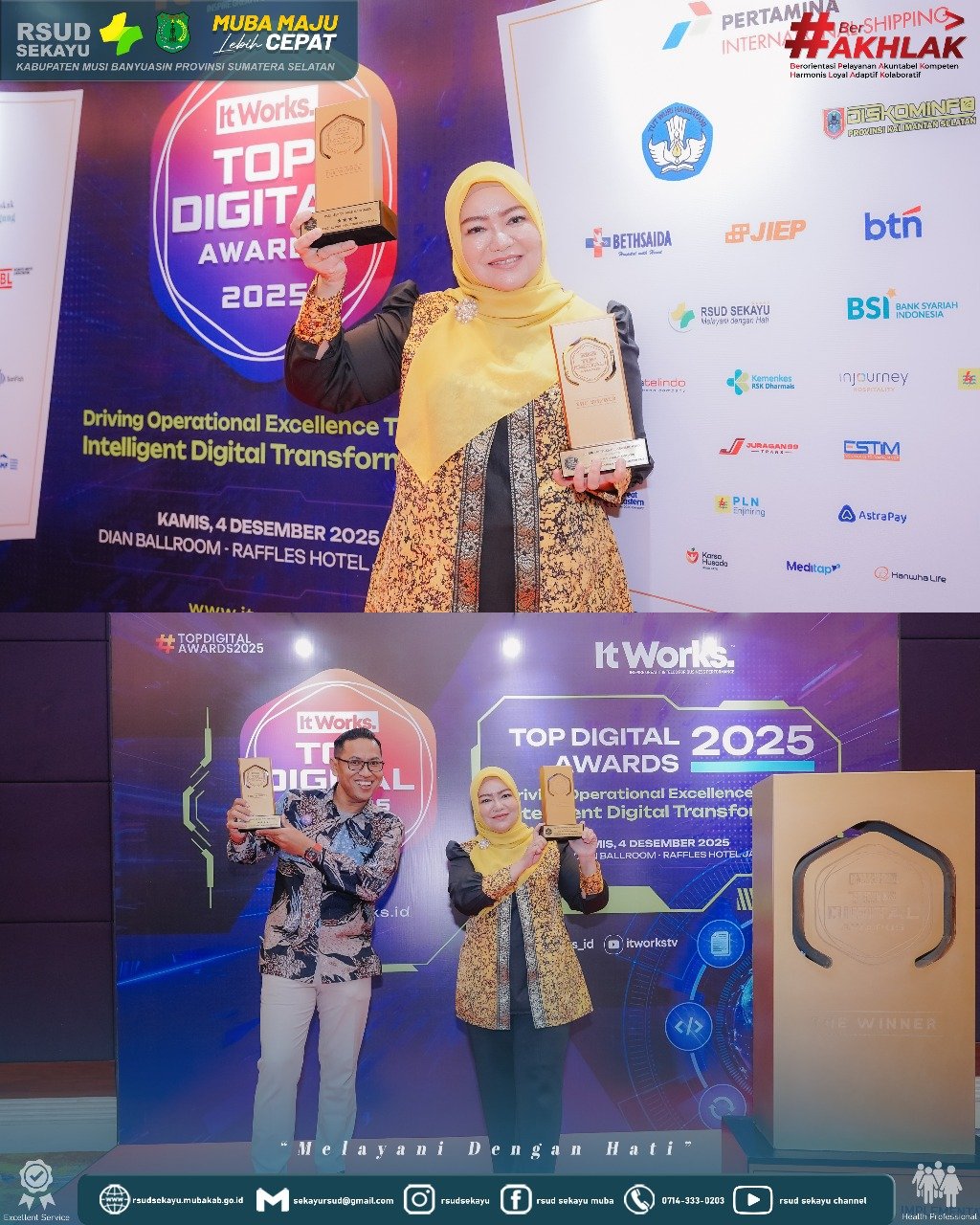 Jakarta, Sentralpost.co – RSUD Sekayu Musi Banyuasin (Muba) berhasil membuktikan kapasitasnya sebagai salah satu rumah sakit daerah yang unggul dalam penerapan teknologi pelayanan kesehatan. Dalam ajang TOP Digital Awards 2025 yang digelar di Hotel Raffles, Jakarta, rumah sakit kebanggaan masyarakat Muba ini sukses menyabet dua penghargaan nasional sekaligus. Kamis (4/12/2025)