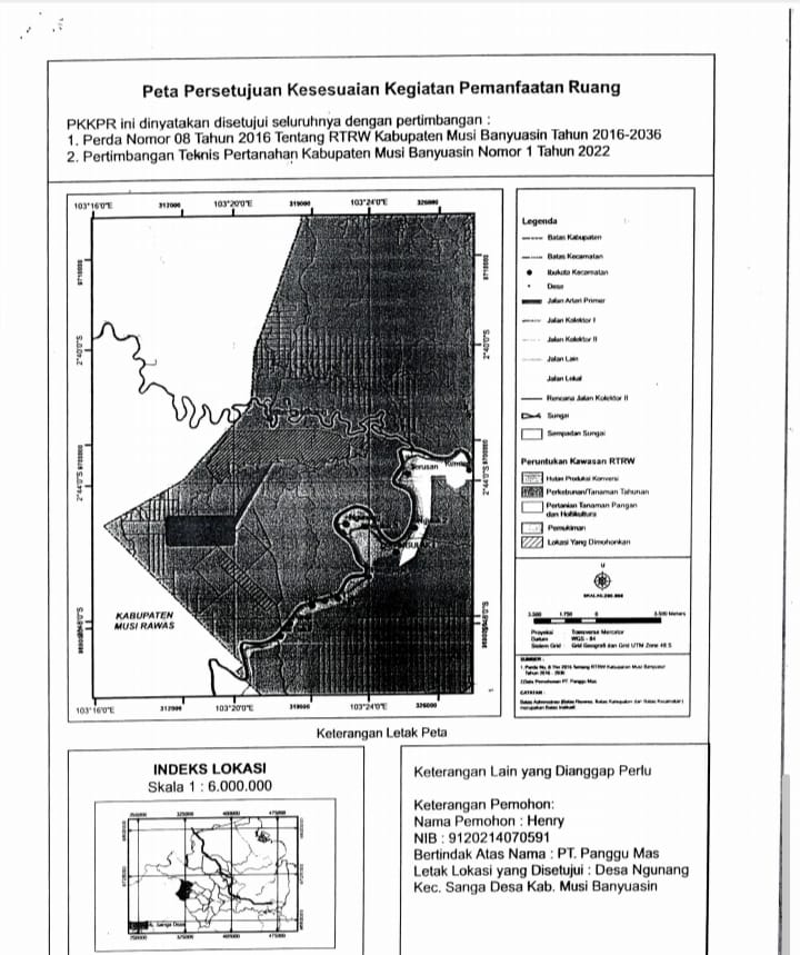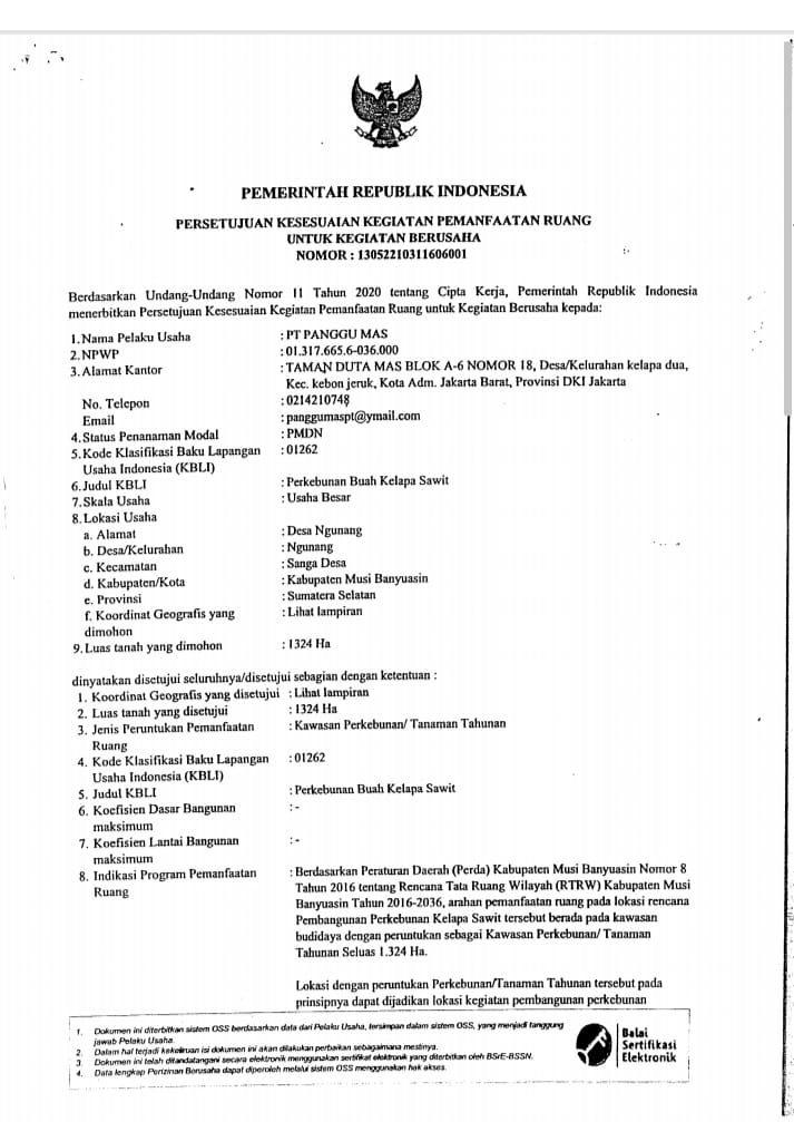 “Kita sudah memilikii Izin Tata kelola ruang dari Disbun Muba, Nomor : 1511/RT/RW/2021. dan ATR /BPN kab Muba dengan Nomor : 10902/2021 pada tanggal 25/04/2022. Dan izin IUP nomor : 130522210311606001. Keluar pada tanggal 13 Mei 2022.lalu. Serta mengatongi izin luas pembangunan seluas lebih kurang,1.350 hektar,Masalah lahan pembangunan kebun dan pembukaan lahan, kita akan cermat dan teliti kedepan ini,” jelas Ahin.